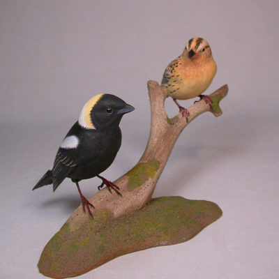 This is an original, fully detailed carving. The bird is entirely hand carved from basswood and painted with acrylic colors. It is mounted on a barbed wire with hardwood base. It measures 10 inches from beak to tail, and stands … Continued