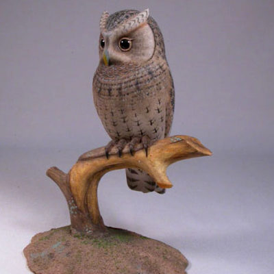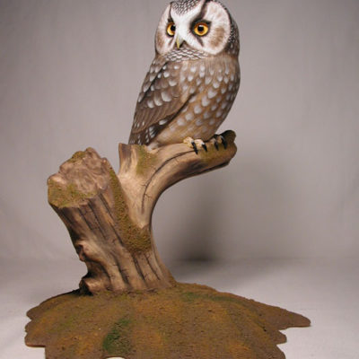 This is an original, fully detailed and life sized carving. The bird is hand carved from basswood and painted with acrylic colors. It is mounted on a hand carved wooden base. Glass eyes and the feet are made from bronze. … Continued