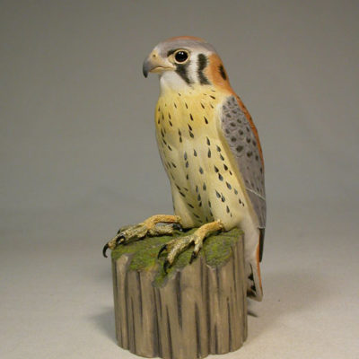 This is a fully detailed carving. From the tip of the beak to the end of the tail is about 12 inches long. The total carving is 14-1/2 inches high. It is hand carved from basswood and painted in acrylics. The bird is mounted on a hand carved wooden base. Glass eyes and metal feet.