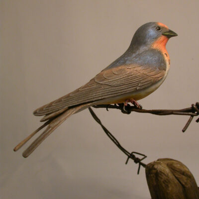 This is an original, fully detailed carving and life sized carving. The bird measures 4-3\/4 inch from the top of the head to the tail. It stands 6-1\/2 inches high including the base. It is hand carved from basswood and painted with acrylic colors. Hand carved wooden base. Glass eyes and the feet are hand made from 2-part product combines of sculpting clay.