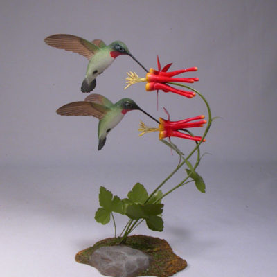 The bird is entirely hand carved from basswood and painted with acrylic colors. It is mounted on a hand carved and hand painted wooden base with hand carved wooden flowers. The bird measures 3″ from tail to beak and the carving stands 7″ tall. Between the two wing tips is 3 1/8 inches long.