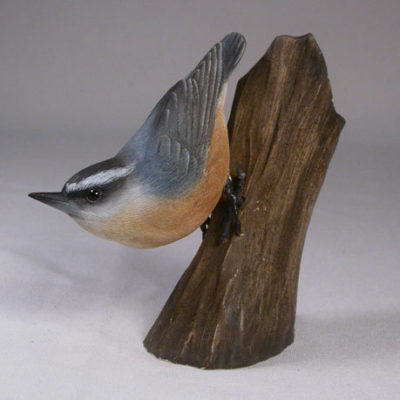 The bird is entirely hand carved from basswood and painted with acrylic colors. It is mounted on a hand carved and hand painted wooden base with flowers.  The carving stands 9″ tall. The bird is 3″ from beak to the end of the tail, with a 3-1/8″ wingspan. Glass eyes and the feet are hand made from modeling putty.