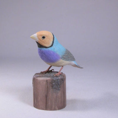 This is an original, fully detailed and life sized carving. The bird is hand carved from basswood and painted with acrylic colors. It is mounted on a hand carved wooden base. Glass eyes and metal feet. The size of the carving measures 41/2″ high and 4-1/2″ long from the beak to the tail.