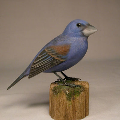 This is an original, fully detailed and life sized carving. The bird measures 5-1/4 inches from the beak to the end of the tail. It stands 7 inches high including the base. The bird is hand carved from basswood and painted with acrylic colors. It is mounted on a hand carved wooden base. Glass eyes and metal feet.
