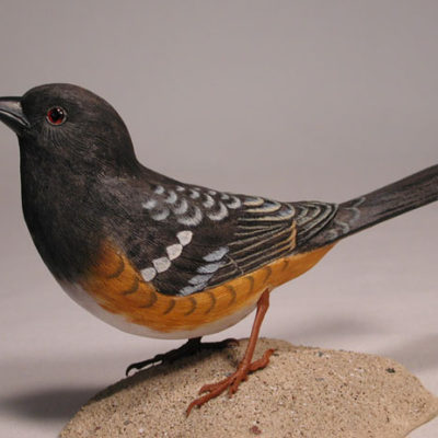 This is an original, fully detailed and life sized carving. The bird is hand carved from basswood and painted with acrylic colors. It is mounted on a hand carved wooden base. Glass eyes and meta feet. The size of the carving measures 5-1/4″ high and 7-1/2″ long from the beak to the tail.